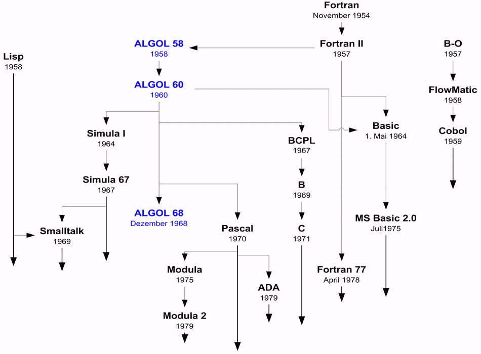 bis in die 70er Jahre. Die Pfeile stellen dar, welche Sprachen die Entwicklung